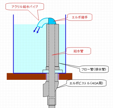 ここに、「エルボ継手」と昨日作った「アクリル給水パイプ」をセットしました。